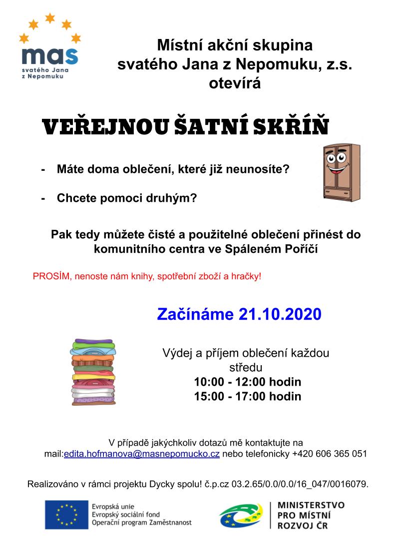 Příjem a výdej oblečení každou středu 10 -12 a 15 - 17 hodin v Komunitním centru ve Spáleném Poříčí.